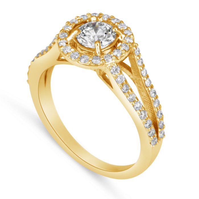 טבעת אירוסין בעלת יהלום מרכזי מוקף בעיגול יהלומים קטנים ונוצצים