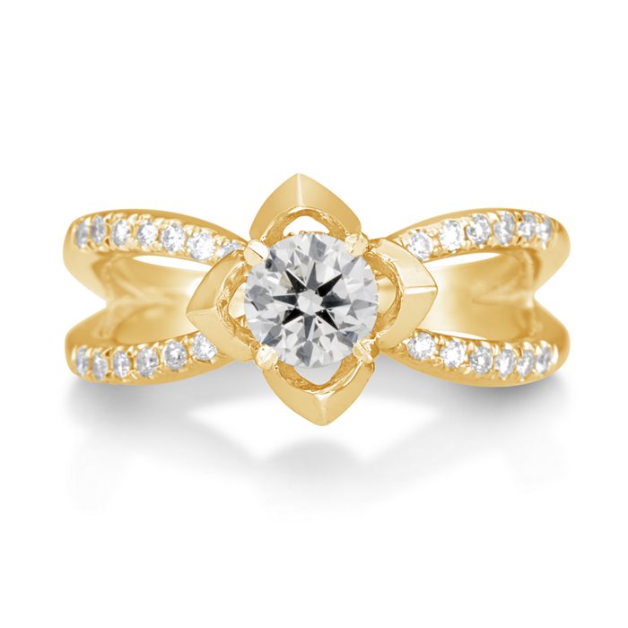 טבעת אירוסין משובצת יהלום מרכזי בצורת פרח שמסביבה משובצים